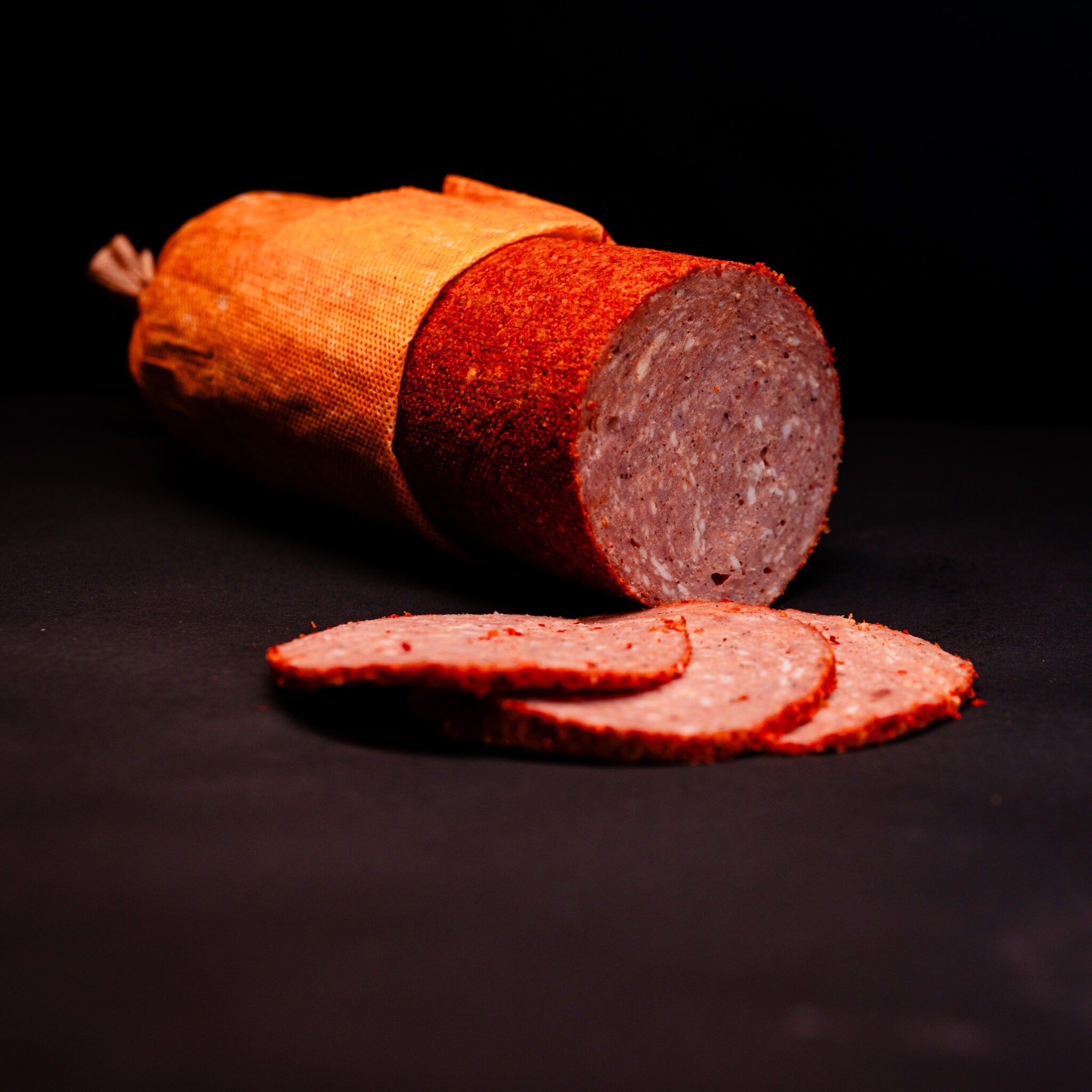 Salamul picant în crustă de chilli de la Măcelăria La Călin este preparat din carne de vită și carne de porc atent selecționate, după rețete vechi din Maramureș, pentru a oferi un gust autentic și echilibrat. Condimentat cu piper, usturoi și chilli, produsul capătă o notă ușor picantă, bine definită, specifică preparatelor de măcelărie. Afumat lent, în mod tradițional, folosind rumeguș din lemn de esență tare, salamul dezvoltă o aromă bogată și o textură consistentă. Este potrivit pentru platouri, gustări sau mese în familie, fiind realizat cu atenție pentru a păstra caracterul autentic al produselor din carne pregătite după rețete vechi din Maramureș.