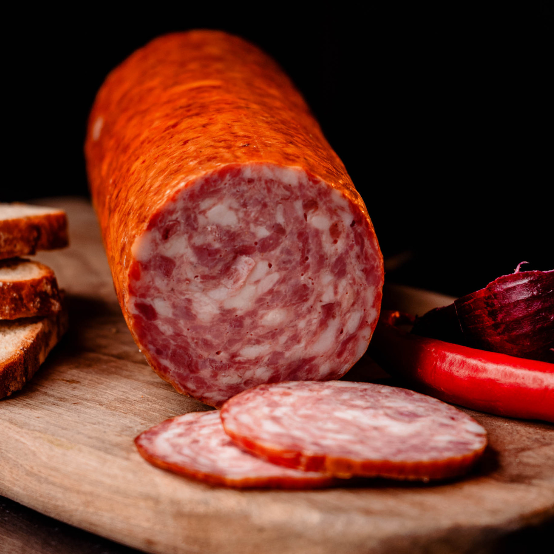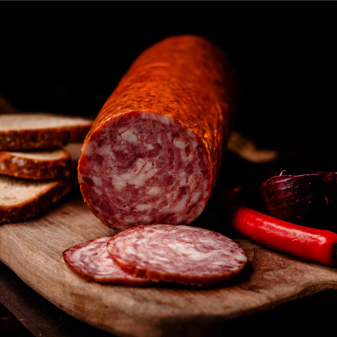 Salamul rustic de la Măcelăria La Călin este preparat din carne de porc și slănină atent selecționate, după rețete vechi din Maramureș, pentru a oferi un gust autentic și echilibrat. Condimentat cu sare, piper, boia și coriandru, salamul capătă o aromă plăcută și specifică preparatelor de măcelărie. Preparat cu grijă pentru a păstra textura și gustul autentic al produselor din carne, salamul rustic este potrivit pentru platouri, gustări sau sandvișuri, fiind realizat cu atenție pentru a păstra caracterul autentic al produselor din carne pregătite după rețete vechi din Maramureș.