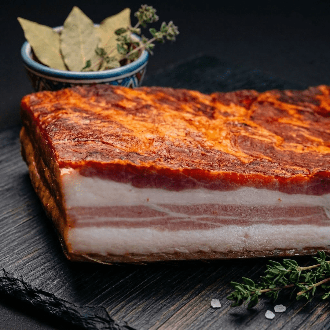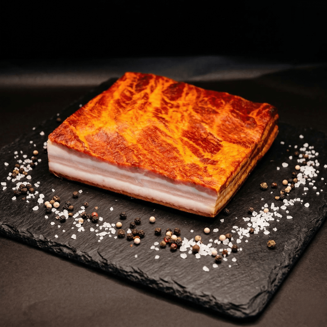 Slănina tradițională cu carne de la Măcelăria La Călin este obținută din piept de porc atent selecționat, pregătită după rețete vechi din Maramureș, pentru a oferi un gust autentic și echilibrat. Produsul este afumat lent, în mod tradițional, folosind rumeguș din lemn de esență tare, pentru a dezvolta o aromă bogată și specifică preparatelor de măcelărie. Prin procesul de afumare, slănina capătă o textură fragedă și un gust intens, fiind potrivită pentru platouri, gustări sau preparate tradiționale. Este realizată cu atenție pentru a păstra caracterul autentic al produselor din carne pregătite după rețete vechi din Maramureș.